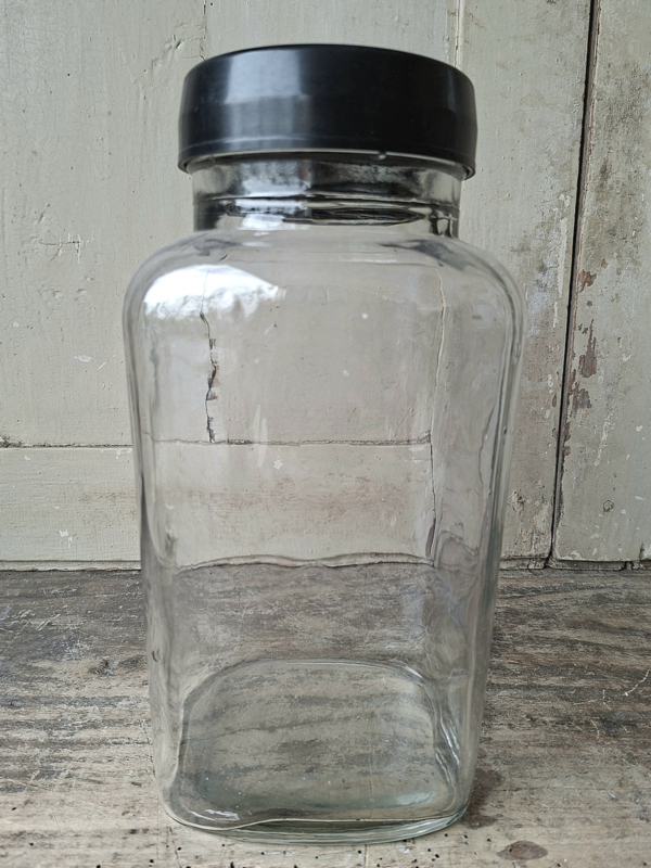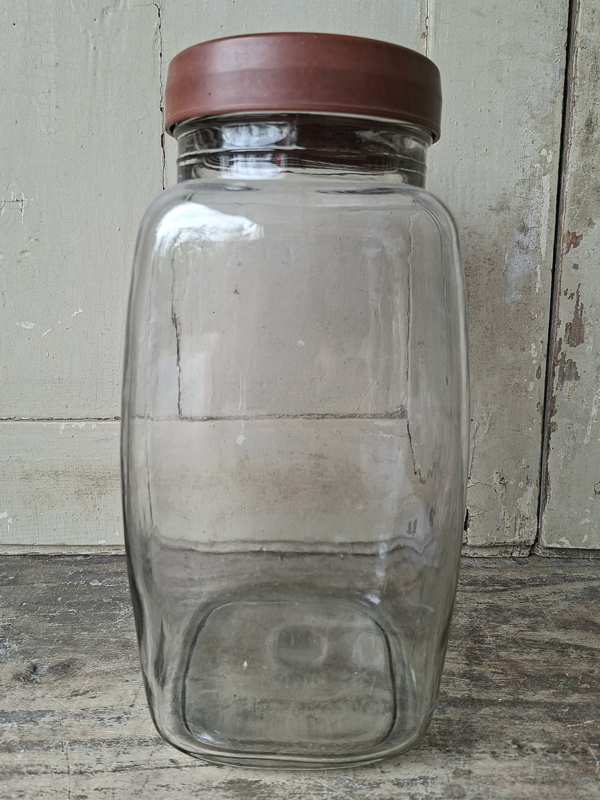 Grote VoorraadpotOude grote vintage glazen voorraadpot. Handgegoten glas en kunststof deksel.