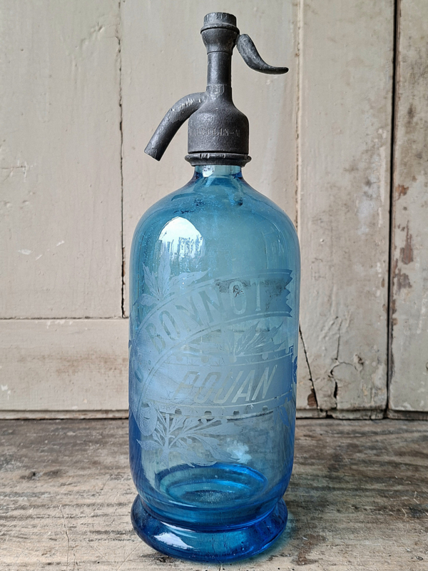 Spuitfles G.BonnotOude franse spuitfles in een blauw glas met opdruk. Op de opdruk is te lezen dat deze spuitfles van het etablissement was van G.Bonnet - Puoan. De fles heeft door het vele gebruik en ouderdom sporen. Het glas heeft oude aanslag…