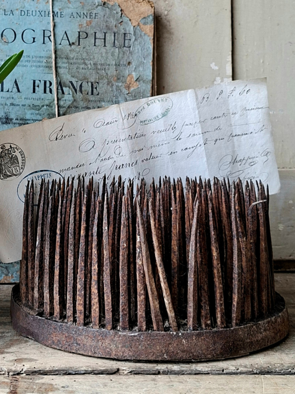 Grote WolkamHele oude grote wolkam van 20cm doorsnede. Geweldig verouderd, de handgemaakte spijkers zijn ooit in het hout geslagen. Nu roestig en doorleefd verouderd. Mooi als decoratie. Deze wolkam is gebruikt en heeft tussen de spijkers op…