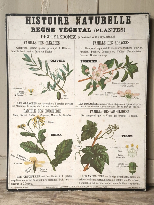 SchoolplaatOude franse vintage schoolplaat. Deze schoolplaat van karton is origineel en authentiek. Op de afbeeldingen zijn. Oleaceae (Olijffamilie), Rosaceae (Rozenfamilie), Cruciferae (Kruisbloemenfamilie) en Ampelidaceae…