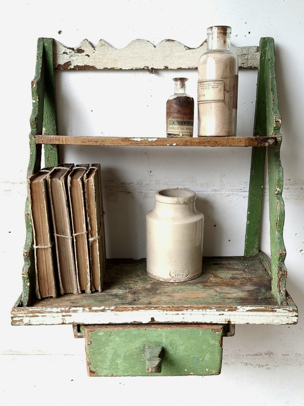 Klein WandrekjeHeel oud klein houten wandrekje. Het is in authentieke staat en heeft diverse oude verflagen. De verf is doorleefd met craquelé. Aan de onderzijde is een klein laatje dat open en dicht schuift. Dit rekje kun je alleen ophangen…