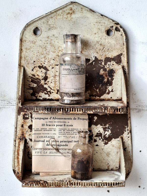 WandrekjeHeel oud wandrekje van blikmetaal. Het is zo shabby verouderd, de originele verf verweerd met roestkleur. De ouderdom heeft sporen achterlaten. Door het kleine formaat heb je hier altijd wel een plekje voor.