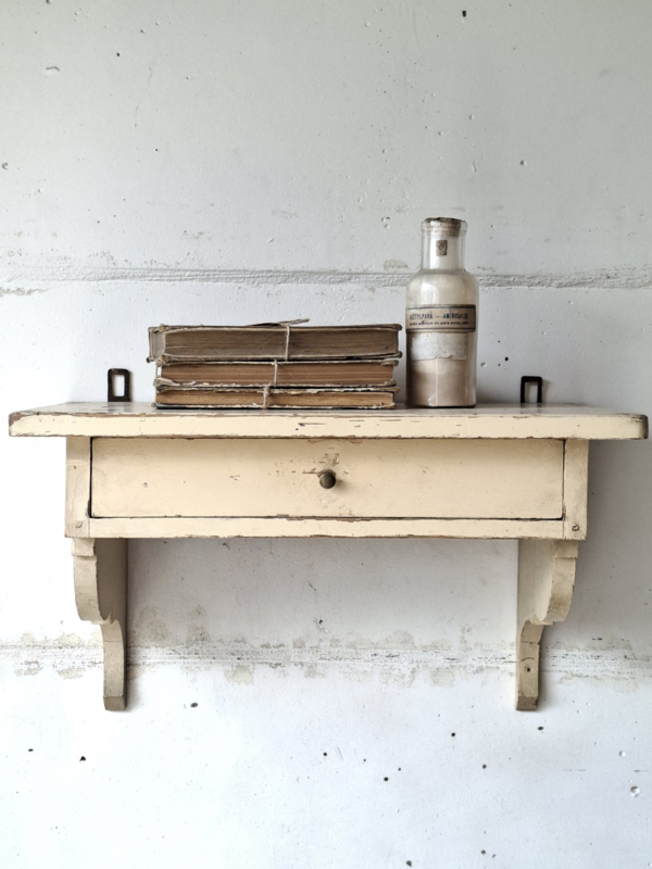 Wandplankje LadeOud wandplankje met lade. In de oude lichtbeige verf, verouderd en geleefd. Aan de achterzijde de originele ophanghaken. De lade schuift open en dicht.